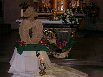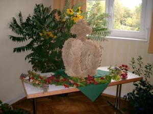 Die Erntekrone wurde von Mitgliedern des OGV´s selbst angefertigt und zusammen mit einem Korb, gefüllt mit Gemüse und Früchten, am Erntedankgottesdienst in die St. Vitus-Kirche gebracht.